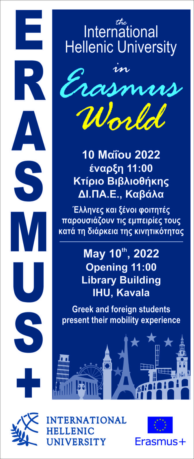 Την ερχόμενη Τρίτη 10/5 στις 11:00 στο κτίριο της βιβλιοθήκης το γραφείο Erasmus της Πανεπιστημιούπολης Καβάλας διοργανώνει (σε συνεργασία με τους εισερχόμενους Erasmus+ students) ημερίδα σχετικά με το πρόγραμμα Erasmus+.