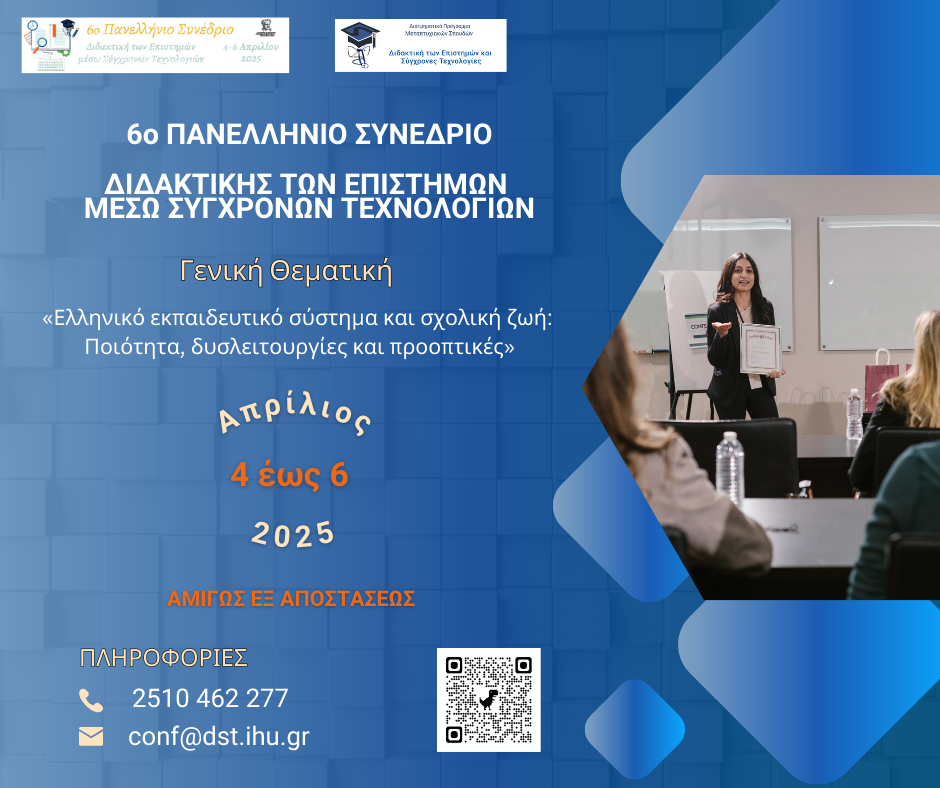 Το 6ο Πανελλήνιο Συνέδριο Διδακτικής των Επιστημών μέσω Σύγχρονων Τεχνολογιών θα πραγματοποιηθεί αμιγώς εξ αποστάσεως από 4 έως και 6 Απριλίου 2025, υπό την αιγίδα του Διατμηματικού Προγράμματος Μεταπτυχιακών Σπουδών «Διδακτική των Επιστημών και Σύγχρονες Τεχνολογίες» του Δημοκριτείου Πανεπιστημίου της Θράκης και του Εργαστηρίου Διδακτικής, Υπολογιστικών και Εφαρμοσμένων Μαθηματικών και Μικρομαγνητισμού του τμήματος Φυσικής του ΔΠΘ.