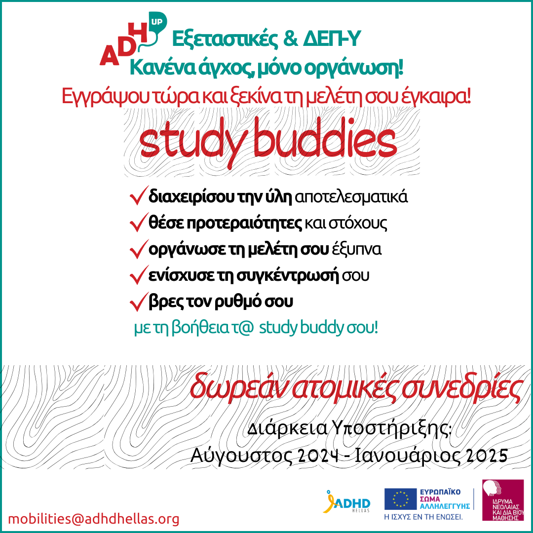 26 Jul,2024 ΔΕΛΤΙΟ ΤΥΠΟΥ STUDY BUDDIES (ΦΙΛΑΡΑΚΙΑ ΜΕΛΕΤΗΣ) ΤΟΥ ΕΡΓΟΥ ESC ADHD-UP, ADHD HELLAS Δελτίο Τύπου (πατήστε εδώ) Έντυπο (πατήστε εδώ) Prev Next